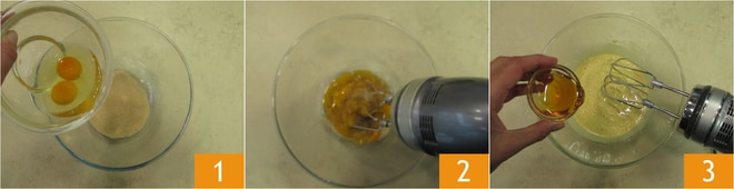 Um den Brombeer-Ricotta-Kuchen zuzubereiten, lassen Sie den Ricotta abtropfen. Geben Sie in eine Schüssel den braunen Zucker und die ganzen Eier 1, schlagen Sie alles mit elektrischen Handrührgeräten, bis eine helle und schaumige Mischung entsteht 2. Fügen Sie den Honig hinzu 3.