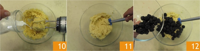 Arbeiten Sie alles, dann fügen Sie die Milch hinzu, während Sie weiter mit den Rührgeräten arbeiten 10. Sobald es fertig ist 11, fügen Sie 400 g gewaschene und vorsichtig getrocknete Brombeeren hinzu 12.