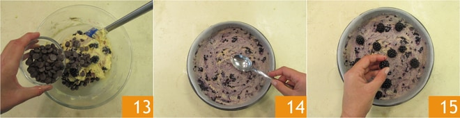 Fügen Sie auch die Schokoladentropfen hinzu und mischen Sie 13. Legen Sie eine 20 cm große Springform mit Backpapier aus, gießen Sie dann den Teig hinein, glätten Sie die Oberfläche mit der Rückseite des Löffels 14. Decken Sie sie mit den restlichen Brombeeren ab 15.