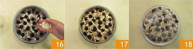 Streuen Sie auch die Mandelblättchen darüber 16 und backen Sie im vorgeheizten statischen Ofen bei 180° für ca. 45 Minuten (überprüfen Sie das Backen und machen Sie den Zahnstocher-Test, bevor Sie den Kuchen herausnehmen). Nach dem Backen nehmen Sie den sehr weichen Ricottakuchen heraus 17, lassen ihn abkühlen und nehmen ihn dann aus der Form, um vollständig abzukühlen. Servieren Sie ihn mit Puderzucker nach Belieben 18.