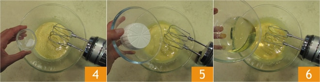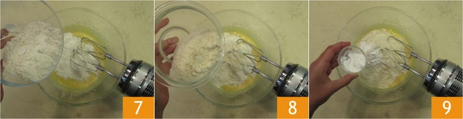 Sobald das Öl aufgenommen ist, fügen Sie das Mehl Typ 0 7, das Mandelmehl 8 und das gesiebte Backpulver 9 hinzu.