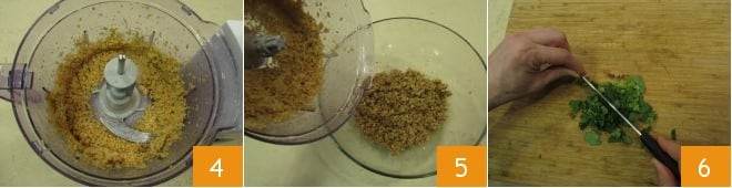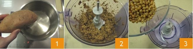 Um die Seitan-Burger vorzubereiten, kocht zuerst die Süßkartoffeln für etwa 25 Minuten 1. In der Zwischenzeit kümmert euch um die Zubereitung der Burger: Gebt den Seitan in einen Mixer und zerkleinert ihn grob 2; stellt ihn dann beiseite. Gebt die Kichererbsen in das Mixerglas 3