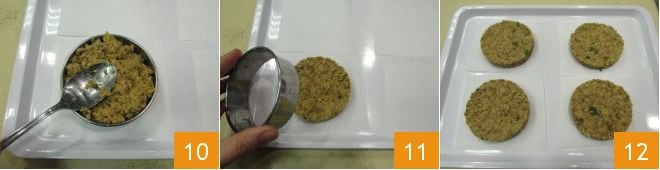 Platziert sie auf einem Tablett und legt auf eines davon einen 8 cm Durchmesser Ausstechring. Füllt ihn mit der gerade vorbereiteten Masse und drückt sie mit einem Löffel fest 10. Entfernt dann vorsichtig den Ausstechring 11 und wiederholt denselben Vorgang für die anderen 12. Deckt alles mit Frischhaltefolie ab und stellt es zur Festigung in den Kühlschrank.