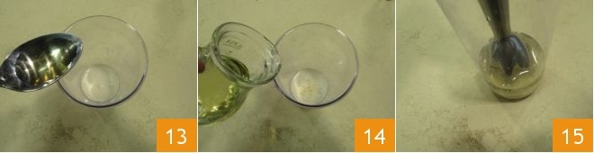 In der Zwischenzeit bereitet die vegane Mayonnaise zu: gebt in ein Mixerglas die Sojamilch und den Reisessig 13. Salzt es, gebt dann auch das Öl dazu und emulgiert alles 15,
