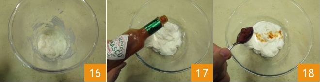 bis ihr eine konsistenzähnliche Mayonnaise erhaltet 16. Gebt dann ein paar Tropfen Tabasco dazu 17, einen Teelöffel Tomatenmark 18 und vermischt alles.