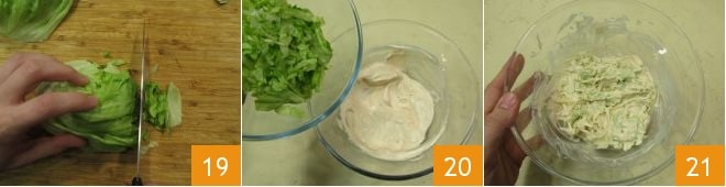 Wascht die Salatblätter, trocknet sie und schneidet sie in feine Julienne-Streifen 19. Fügt sie der veganen Mayonnaise hinzu 20 und vermischt alles 21.