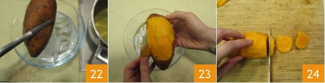 Zu diesem Zeitpunkt sollten auch die Kartoffeln fertig sein, sie sollten gar, aber nicht zu weich sein. Gießt sie ab und legt sie für einige Sekunden in eine Schüssel mit Eiswasser 22. Schält sie und schneidet sie in etwa 1,5 cm dicke Scheiben.