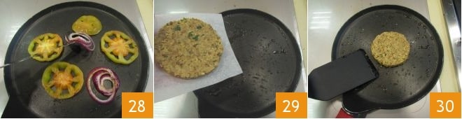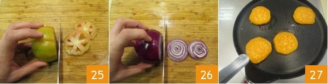 und macht dasselbe auch mit den Tomaten und Zwiebeln 28. Nehmt die Burger 29 und legt sie in dieselbe Pfanne, in der ihr das Gemüse gegart habt. Wartet etwa 3 Minuten, dann wendet sie 30
