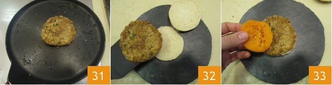 und bratet sie auch von der anderen Seite für ein paar Minuten 31. Legt sie in das Brötchen 32, fügt die Süßkartoffeln hinzu 33,