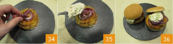 die Tomaten, die Zwiebeln 34 und die Mayonnaise zusammen mit dem Salat 35. Schließt das Brötchen und serviert es noch heiß 36.