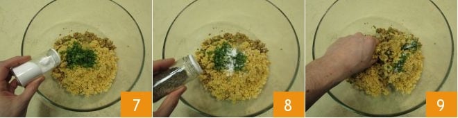 gebt ihn dann zusammen mit dem Salz 7 und Pfeffer 8 zur Masse hinzu. Vermengt alles 9, dann schneidet 4 Quadrate Backpapier von etwa 12x12 cm Größe.