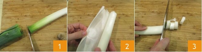 Um die Selleriecremesuppe zuzubereiten, säubert zuerst das Gemüse: Spült den Lauch unter fließendem Wasser, entfernt den grünen Teil 1 und den Wurzelansatz, der sich am anderen Ende befindet, schneidet dann mit einem Messer längs ein und entfernt die härteren äußeren Blätter 2; schneidet schließlich den Lauchstängel in etwa 2 cm dicke Stücke 3. Ihr solltet etwa 280 g gesäuberten Lauch erhalten.