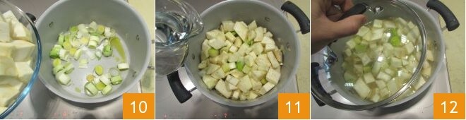 und die Selleriestücke 10, erhöht die Hitze und röstet sie für weitere 5 Minuten, dann gießt das kalte Wasser dazu 11, deckt mit einem Deckel ab 12 und lasst es etwa 40 Minuten bei mittlerer Hitze kochen.
