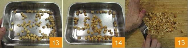 In der Zwischenzeit, legt die geschälten Haselnüsse auf ein Backblech 13 und röstet sie in einem vorgeheizten Umluftofen bei 190° für etwa 15 Minuten, bis sie goldbraun sind 14; wenn sie geröstet sind, zerdrückt die Haselnüsse grob mit der flachen Seite eines Messers 15.