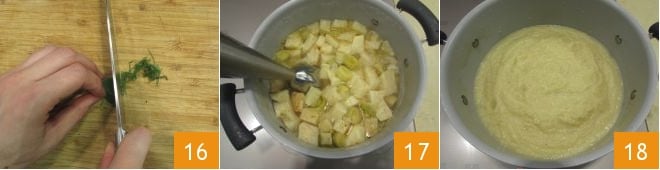 Schließlich hackt die Salbeiblätter, die ihr beiseitegelegt habt, fein 16. Nach der Kochzeit des Gemüses, schaltet den Herd aus und püriert alles mit einem Stabmixer 17, bis ihr eine cremige Konsistenz erhaltet 18.