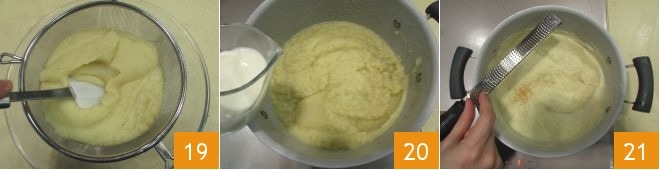 Gießt die Creme durch ein Sieb und streicht sie mit einem Spatel glatt, um eine samtige Konsistenz zu erreichen 19. Fügt die frische Sahne 20 und die geriebene Muskatnuss 21 hinzu und mischt alles gut durch.