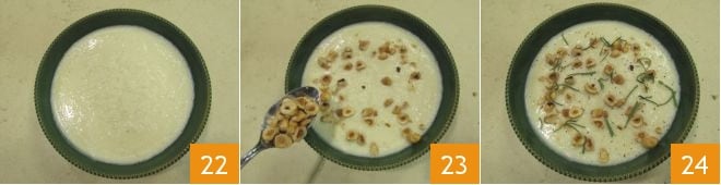 Nun könnt ihr die Cremesuppe in einen tiefen Teller geben 22, die Oberfläche mit den gerösteten Haselnüssen garnieren 23, etwas gehackten Salbei hinzufügen und mit Pfeffer abschmecken: Eure köstliche Selleriecremesuppe ist bereit zum Genießen 24!