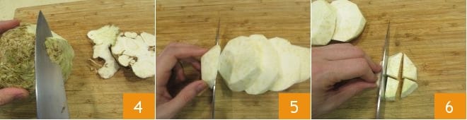 Jetzt kommt der Knollensellerie an die Reihe: Wascht ihn gründlich unter fließendem Wasser, um die Erdreste zu entfernen, dann schält ihn mit einem scharfen Messer 4 und schneidet ihn zuerst in Scheiben 5 und dann in etwa 2 cm dicke Stücke 6. Ihr solltet etwa 1,2 kg gesäuberten Knollensellerie erhalten.