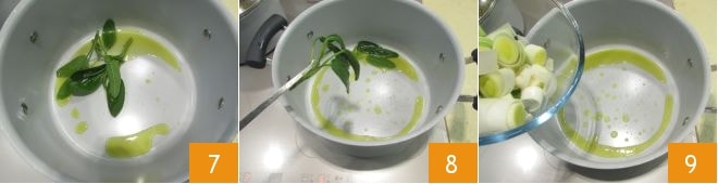 Erhitzt das Öl in einem Topf, fügt die Salbeiblätter hinzu (hebt ein paar Blätter für die endgültige Garnitur auf) und lasst sie etwa 5 Minuten bei mittlerer bis niedriger Hitze das Öl aromatisieren 7, dann entfernt sie mit einer Küchenzange 8. Fügt nun die Lauchstücke hinzu 9