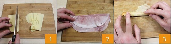 Um die im Ofen gebackenen Stangen mit Schinken und Emmental zuzubereiten, beginnen Sie damit, 12 dünne Scheiben Emmental zu schneiden 1 und legen Sie dann eine Scheibe gekochten Schinken auf ein Schneidebrett und halbieren Sie sie quer 2. Nehmen Sie dann eine Tomatenstange und legen Sie die Scheibe Emmental darum 3, in der Mitte der Tomatenstange, sodass beide Enden frei bleiben.