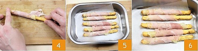 Wickeln Sie auch die Scheibe gekochten Schinken auf die gleiche Weise 4. Legen Sie die so garnierten Stangen in eine Auflaufform, die mit einem Bogen Backpapier ausgelegt ist 5. Bei 190° im bereits vorgeheizten statischen Ofen (160° im Umluftofen) fünf Minuten backen, bis der Käse geschmolzen ist 6.
