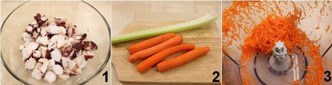 Um die klassischen Blätterteigblätter mit Oktopussalat zuzubereiten, können Sie entweder einen bereits zubereiteten Oktopussalat verwenden oder den Salat nach dem Rezept, das Sie Petersilien-Oktopus-Salat (Oktopussalat) finden, unter Verwendung eines frischen Oktopus zubereiten. Sie benötigen 100 g Oktopussalat, den restlichen Salat können Sie verwenden, um die Häppchen zu begleiten, indem Sie, wenn Sie es mögen, gekochte Kartoffeln hinzufügen. Bereiten Sie dann die Gemüse-Julienne vor: Waschen und schälen Sie die Karotten und den Sellerie 2, die den Oktopus begleiten werden: Zerkleinern Sie die Karotte und den Sellerie zur Julienne mit einer Küchenmaschine 3