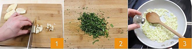 Um die Blätter mit gebratenem Topinambur zuzubereiten, beginnen Sie damit, den Topinambur zu schälen und zu reinigen. Schneiden Sie ihn dann in Scheiben und anschließend in regelmäßige Würfel 1. Hacken Sie die aromatischen Kräuter sehr fein und stellen Sie sie beiseite 2. Geben Sie einen Schuss Öl in die Pfanne und fügen Sie die gewürfelten Topinambur hinzu. Lassen Sie ihn ein paar Minuten kochen, salzen und pfeffern Sie nach Geschmack 3;