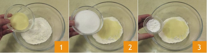 Um das Sfouf zuzubereiten, geben Sie das Mehl, den Grieß 1, den Zucker 2 und das Backpulver 3 in eine große Schüssel.