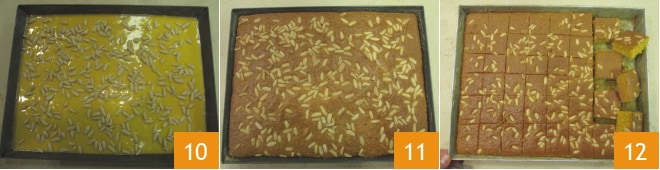 Backen Sie im vorgeheizten statischen Ofen bei 180° für etwa 35 Minuten 10. Nach dem Backen nehmen Sie den Kuchen aus dem Ofen und lassen ihn abkühlen 11. Servieren Sie das Sfouf in Quadrate oder Rauten von etwa 4 cm geschnitten 12!