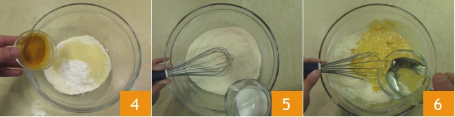 Fügen Sie die Kurkuma 4 hinzu und vermischen Sie die trockenen Zutaten mit einem Schneebesen. Während Sie weiterhin rühren, fügen Sie auch die Milch 5 und das Pflanzenöl 6 hinzu.