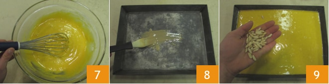 Sie sollten eine glatte und homogene Mischung erhalten 7. Nehmen Sie nun eine rechteckige Backform mit hohen Rändern der Größe 38x25 cm und pinseln Sie den Boden und die Ränder mit Tahina ein 8. Geben Sie die Mischung hinein und streuen Sie die Pinienkerne auf die Oberfläche 9.