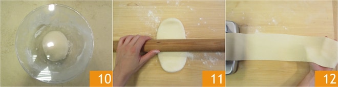 Formen Sie einen homogenen Teigklumpen, decken Sie ihn mit Frischhaltefolie ab und lassen Sie ihn 30 Minuten ruhen 10. Rollen Sie den Teig zuerst mit einem Nudelholz aus 11, dann geben Sie ihn durch die Nudelmaschine 12, um eine sehr dünne Teigplatte zu erstellen.