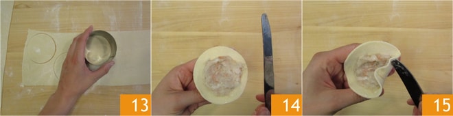 Schneiden Sie mit einem Glas oder einem runden Ausstecher Kreise mit einem Durchmesser von 8 cm aus 13. Geben Sie einen Löffel Füllung in die Mitte des Teigkreises 14. Falten Sie die Ränder mit der Spitze eines Messers 15.