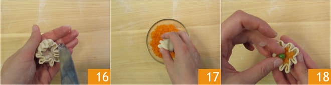 Sodass sie an eine Blume erinnern 16. Garnieren Sie die Oberfläche, indem Sie die obere Seite des Ravioli in eine Schüssel mit geriebenen Karotten tauchen 17. Setzen Sie in die Mitte eine Erbse 18.