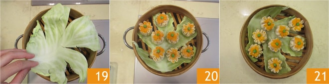 Nehmen Sie einen Dampfgarer, legen Sie ein Kohlblatt darauf, damit die Ravioli nicht kleben 19. Legen Sie die Ravioli hinein 20, decken Sie sie mit dem Deckel ab und garen Sie sie 10-12 Minuten bei mittlerer Hitze. Die Shao Mai Ravioli sind bereit zum Genießen 21.