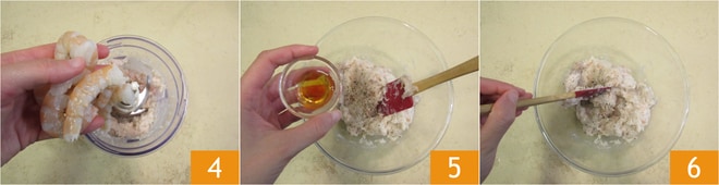 Fügen Sie auch die Garnelen hinzu und pürieren Sie sie fein, um eine homogene Masse zu erhalten 4. Geben Sie die Füllung in eine Schüssel und würzen Sie sie mit Salz, Pfeffer und Reiswein 5. Mischen Sie alles und lassen Sie es 10 Minuten ruhen 6.