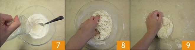 Machen Sie den Teig: Geben Sie das Mehl in eine Schüssel, die lauwarme Wasser in die Mitte und eine Prise Salz 7, mischen Sie 8 und wenn der Teig zu formen beginnt, übertragen Sie ihn auf eine Arbeitsfläche 9.