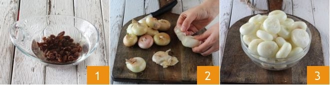 Um das Rezept für die Silberzwiebeln mit Rosinen zuzubereiten, weichen Sie zuerst die Rosinen für 20 Minuten in einem Glas mit lauwarmem Wasser ein 1. In der Zwischenzeit schälen Sie die Silberzwiebeln 2 und sammeln sie in einer Schüssel 3.