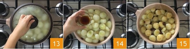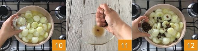 die 100 g Wasser hinzufügen 10. Die Rosinen gut ausdrücken 11 und zu den Silberzwiebeln geben 12.