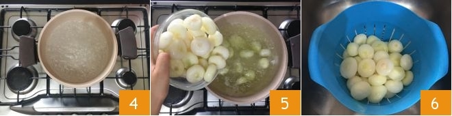 Stellen Sie einen Topf mit gesalzenem Wasser auf den Herd und bringen Sie es zum Kochen 4, dann geben Sie die Silberzwiebeln hinein und blanchieren sie für 2 Minuten 5. Dann abgießen 6 und beiseite stellen.