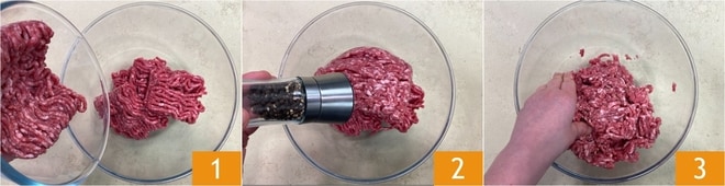 Um den Smash Burger zuzubereiten, mischen Sie zuerst das Rinderhackfleisch und das Schweinehackfleisch in einer Schüssel 1, pfeffern Sie 2 und kneten Sie mit den Händen, um eine homogene Masse zu erhalten 3.