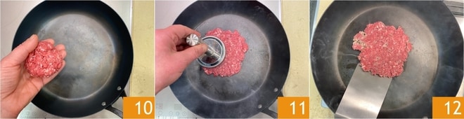 Legen Sie ein Fleischbällchen nach dem anderen in die heiße Pfanne 10 und drücken Sie es sofort mit einem Fleischklopfer flach, indem Sie sehr fest drücken, um das Fleisch gut zu plattieren 11. Nach 60 Sekunden wenden Sie den Burger mit einem Spatel 12.