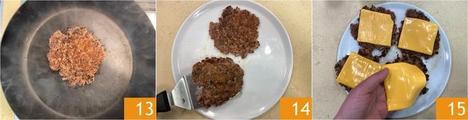 Braten Sie die andere Seite für maximal anderthalb Minuten 13, dann legen Sie den Burger auf einen Teller 14 und fahren Sie auf diese Weise fort, um die anderen zu braten. Decken Sie die Burger sofort mit den Käsescheiben ab, damit sie durch die Hitze schmelzen 15.