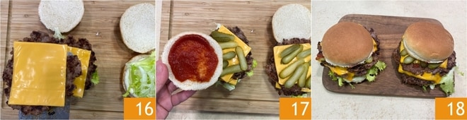 Jetzt sind Sie bereit, die Brötchen zu vervollständigen: Stapeln Sie 2 Burger mit dem Käse für jedes Brötchen 16, dann fügen Sie die Gurkenscheiben hinzu. Zum Schluss schließen Sie das Brötchen mit dem oberen Teil, den Sie mit Ketchup bestrichen haben 17. Ihre fantastischen Smash Burger sind bereit, um genossen zu werden 18!