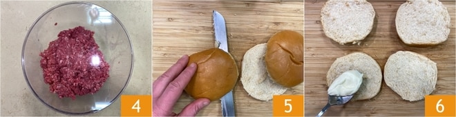 Decken Sie die Schüssel mit Frischhaltefolie ab 4 und stellen Sie sie in den Kühlschrank, während Sie die anderen Zutaten für das Brötchen vorbereiten; alles sollte bereit sein, damit Sie die Burger im letzten Moment braten können. Schneiden Sie die Brötchen in zwei Hälften 5, dann bestreichen Sie den unteren Teil mit Mayonnaise 6.