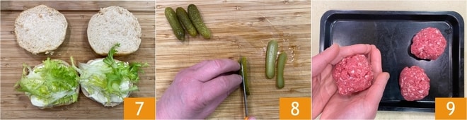 Fügen Sie auch die Salatblätter hinzu 7 und schneiden Sie die Gewürzgurken in Scheiben 8. Legen Sie sie beiseite und erhitzen Sie eine Pfanne aus Eisen, Gusseisen oder Stahl auf dem Herd, sie sollte sehr heiß sein. In der Zwischenzeit nehmen Sie die Fleischmasse heraus, teilen Sie sie in 4 Portionen von jeweils etwa 100 g und formen Sie sie mit den Händen zu einem Fleischbällchen 9.