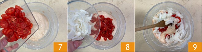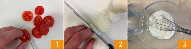 Um die Sommer-Croccantella mit Tomaten vorzubereiten, schneiden Sie zuerst die Tomaten 1 und die Zwiebel 2 in Scheiben und stellen Sie diese zur Seite. Geben Sie das Mehl in eine Schüssel und gießen Sie das Wasser unter Rühren mit einem Schneebesen ein, um Klumpen zu vermeiden 3.