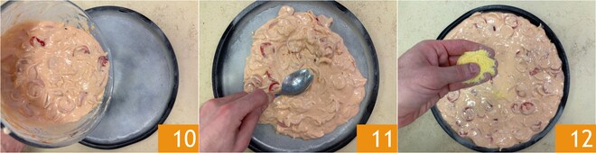 Gießen Sie die Mischung in ein antihaftbeschichtetes Blech von 32 cm, das gefettet und bemehlt ist 10, und glätten Sie die Oberfläche gut 11. Bestreuen Sie die Oberfläche mit Maismehl 12.