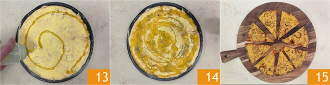 Träufeln Sie mit Öl 13 14 und backen Sie es im statischen Ofen bei 200°C für 50 Minuten, dann erhöhen Sie die Temperatur auf 230°C und backen Sie weitere 10-15 Minuten im Umluftmodus. Ihre Sommer-Croccantella mit Tomaten ist bereit zum Genießen 15!