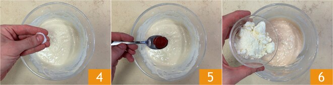 Würzen Sie mit Salz 4 und Tomatenmark 5, dann rühren Sie erneut um. Fügen Sie dann den geriebenen Pecorino hinzu 6.